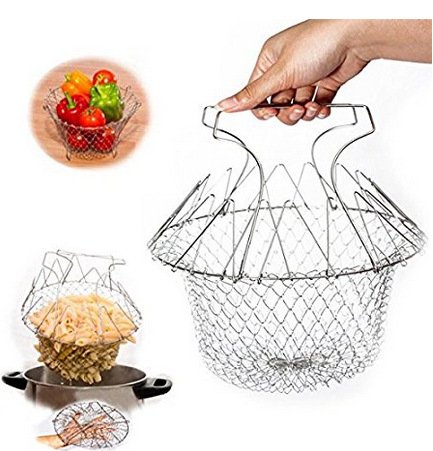 - ⤠Easy to use: Simple design, light and easy to use.This folding cooking basket opens up into a hanging-style basket. Fold it as the way you need.The handle to allow fingers to hold tight. This frying basket is a good helper for the kitchen.
